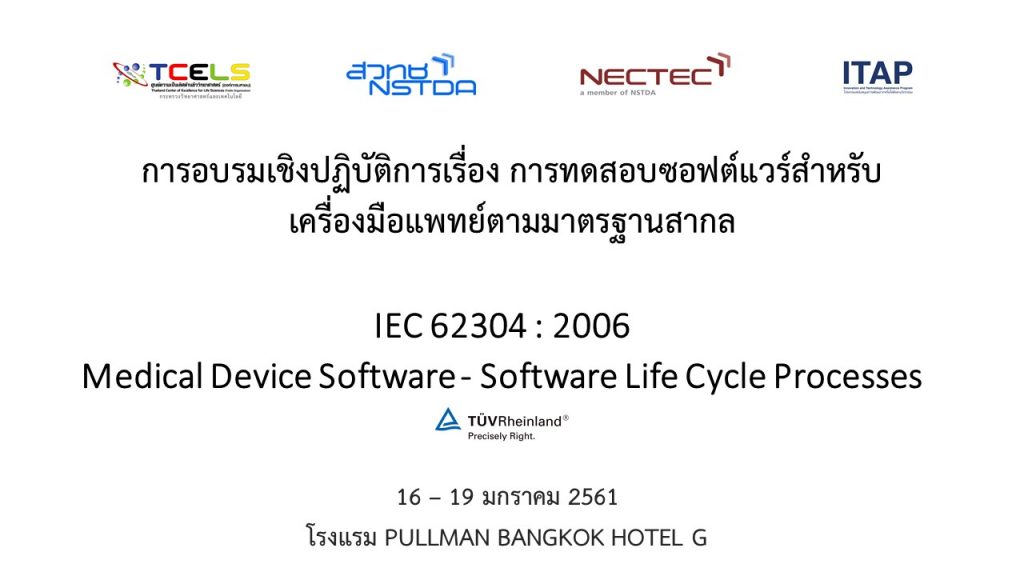 16 ม.ค. 61 ณ โรงแรมพูลแมน กรุงเทพ จี สาทร : กระทรวงวิทยาศาสตร์และเทคโนโลยี สำนักงานพัฒนาวิทยาศาสตร์และเทคโนโลยีแห่งชาติ (สวทช.) โดยศูนย์เทคโนโลยีอิเล็กทรอนิกส์และคอมพิวเตอร์แห่งชาติ (NECTEC) และโปรแกรมสนับสนุนการพัฒนาเทคโนโลยีและนวัตกรรม (ITAP) ร่วมกับ ศูนย์ความเป็นเลิศด้านชีววิทยาศาสตร์ (องค์การมหาชน) (TCELS) จัดกิจกรรมอบรมเชิงปฏิบัติการ “การทดสอบซอฟต์แวร์สำหรับเครื่องมือแพทย์ตามมาตรฐานสากล IEC62304” ภายใต้โครงการส่งเสริมการพัฒนาศักยภาพผู้ประกอบการและสร้างเครือข่ายผู้เชี่ยวชาญด้านการทดสอบและรับรองมาตรฐานซอฟต์แวร์เครื่องมือแพทย์ไทย